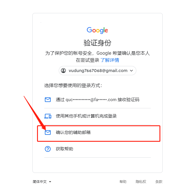 不管页面语言是什么,输入密码后如需要验证身份请选择“第三个选项”,然后输入辅助邮箱。